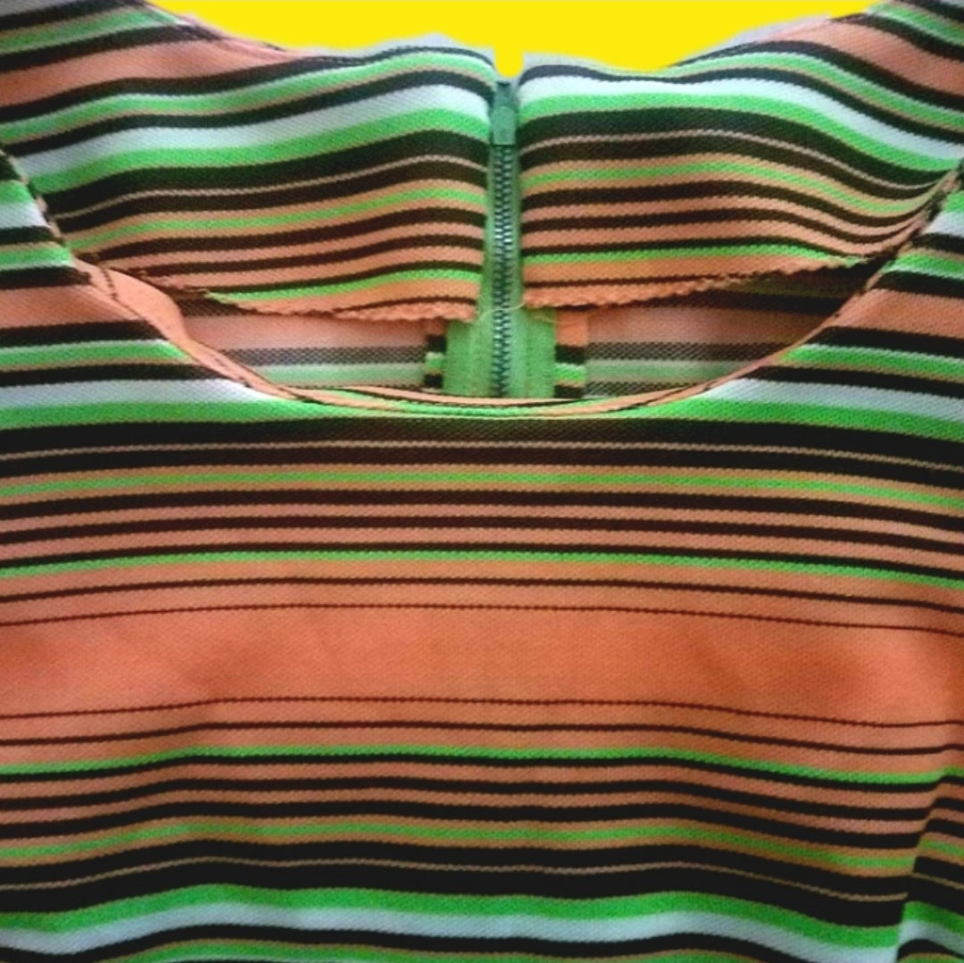 Description: flattering, form fitting, stretchy, orange, lime green and white striped design.