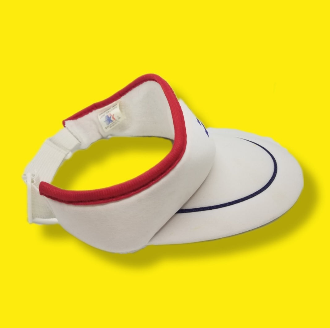 Description: red, white and blue soft visor with Los Angeles U.S.A. Olympics graphic on the front.