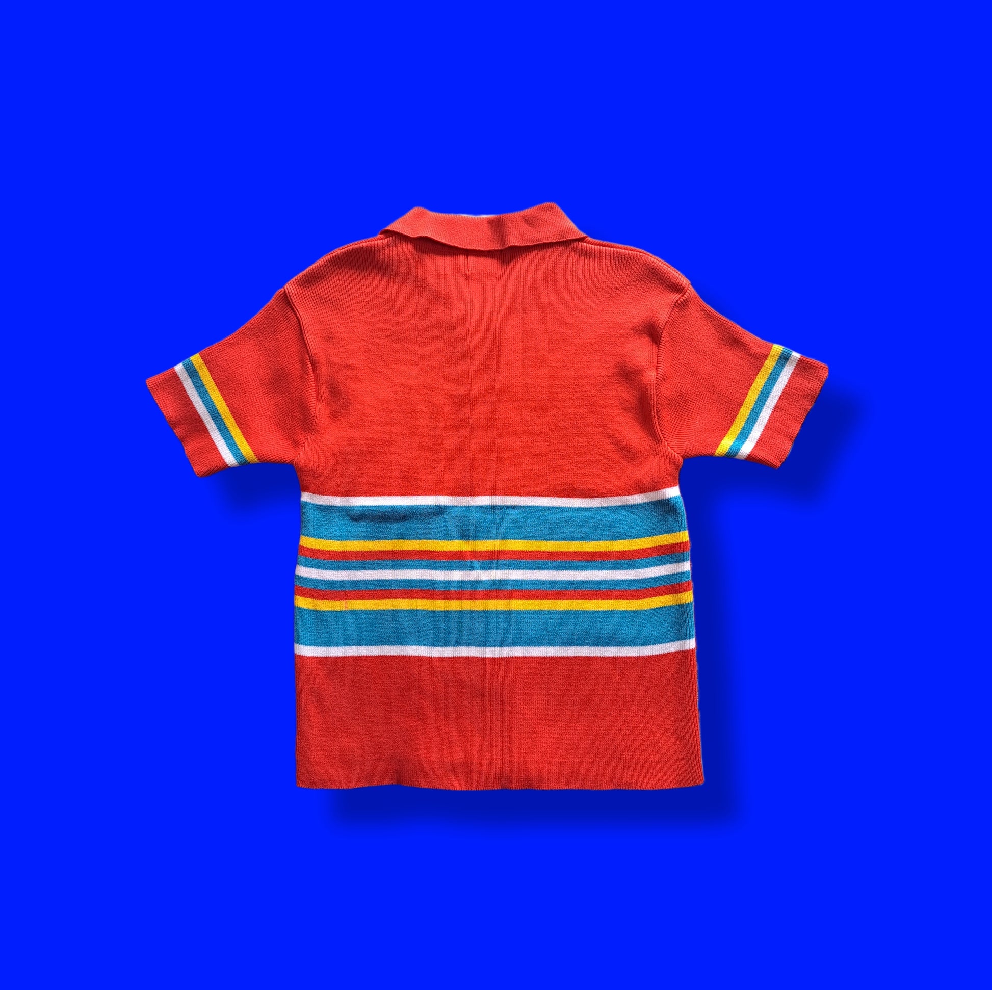 Description: Gorgeous form-fitting, red, gold, white and turquoise striped short sleeved collared top with CK emblem zip front and "CK Jeans" logo on chest pocket.