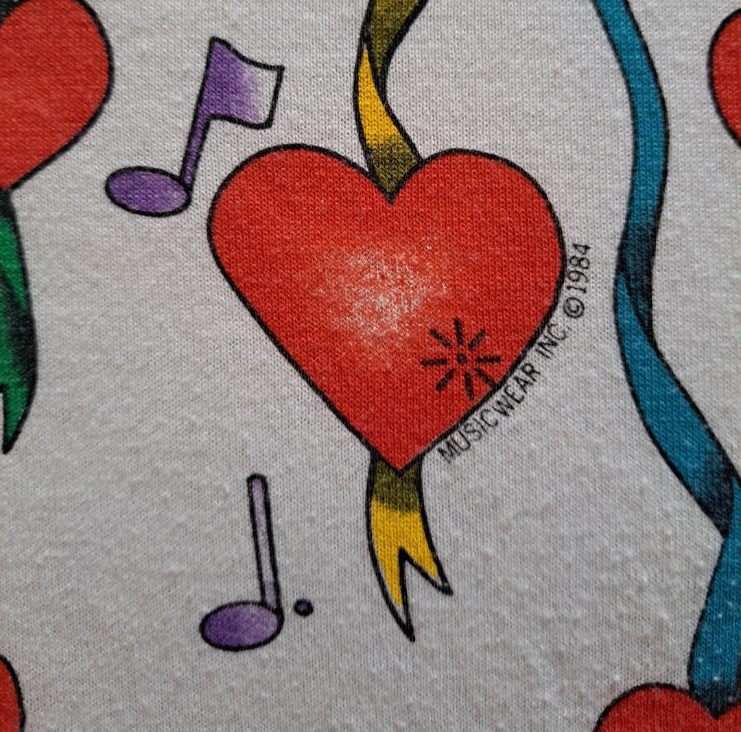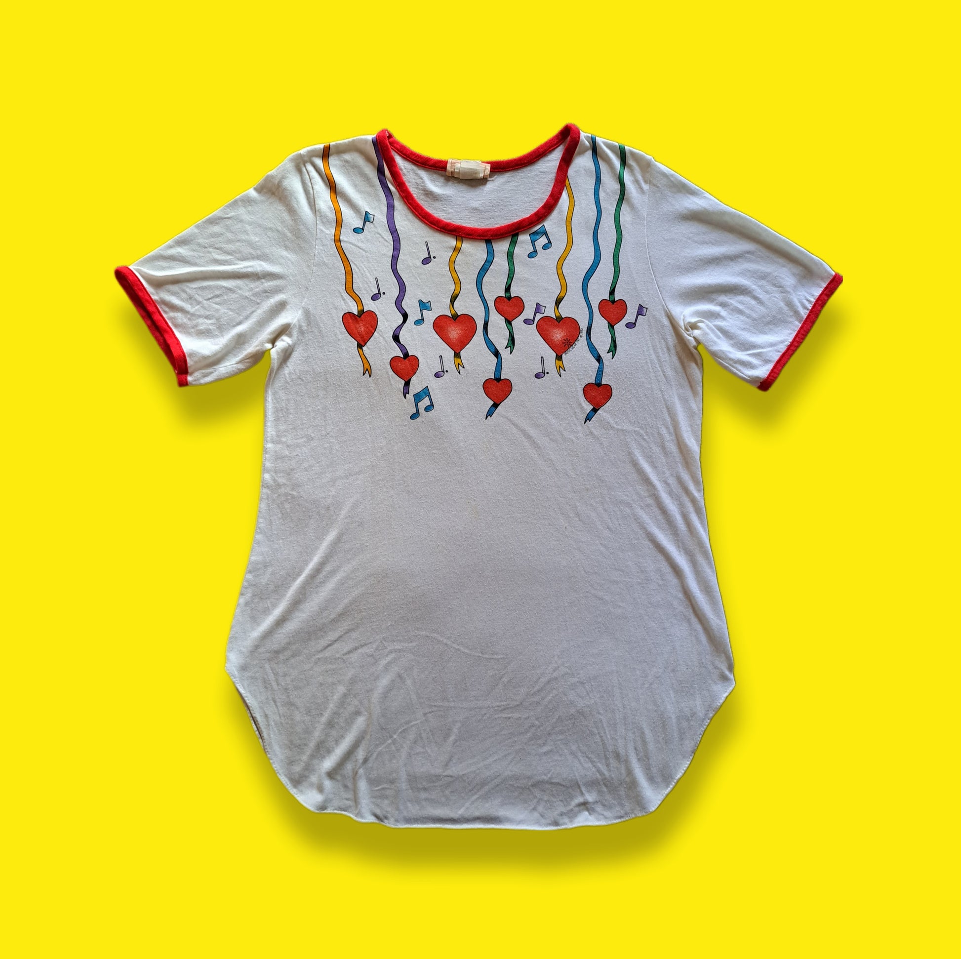 Description: super cute, soft and thin ringer t-shirt nighty, above-the-knee, white and red details with musical notes and heart graphics on front.
