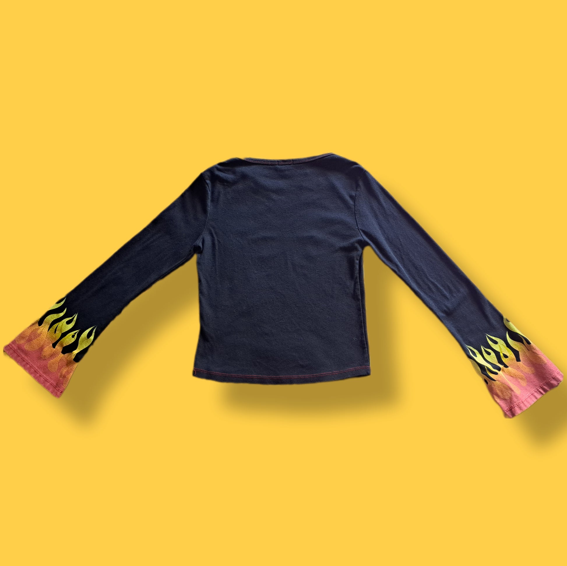 Description: black, orange and yellow long sleeve top with butterfly and flames graphic on front and bell flare sleeves.
