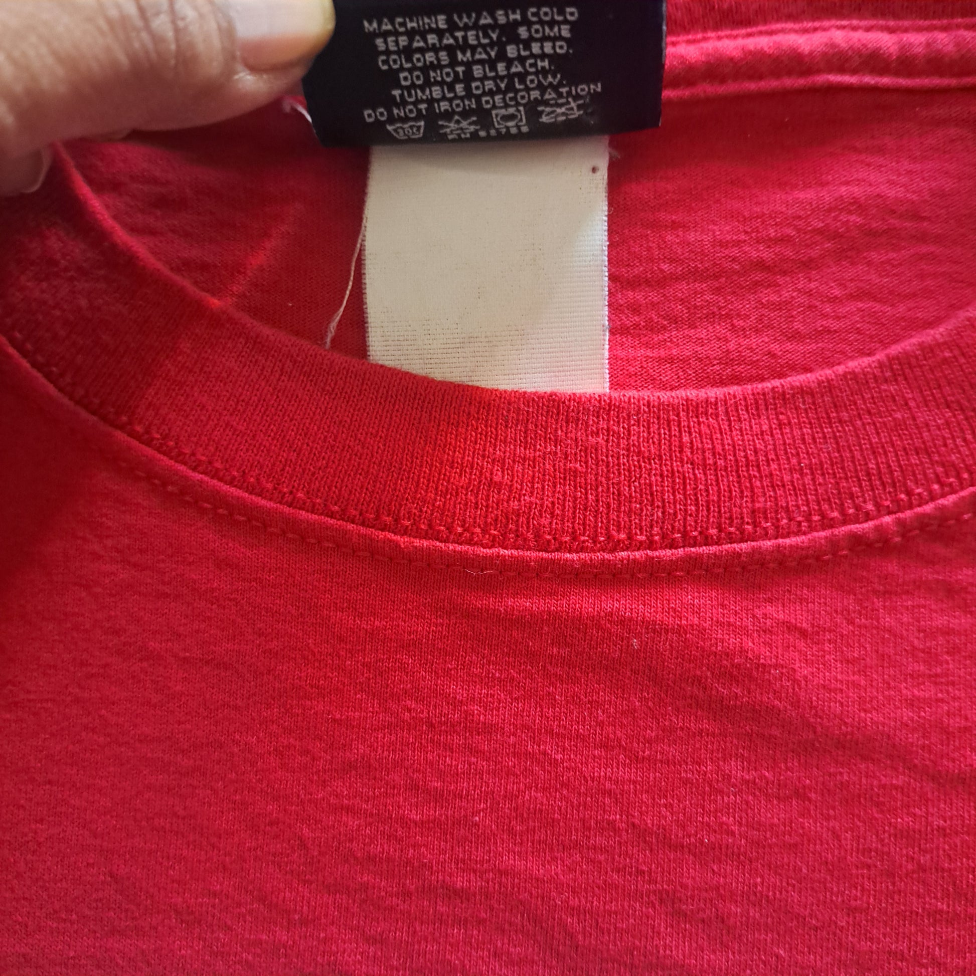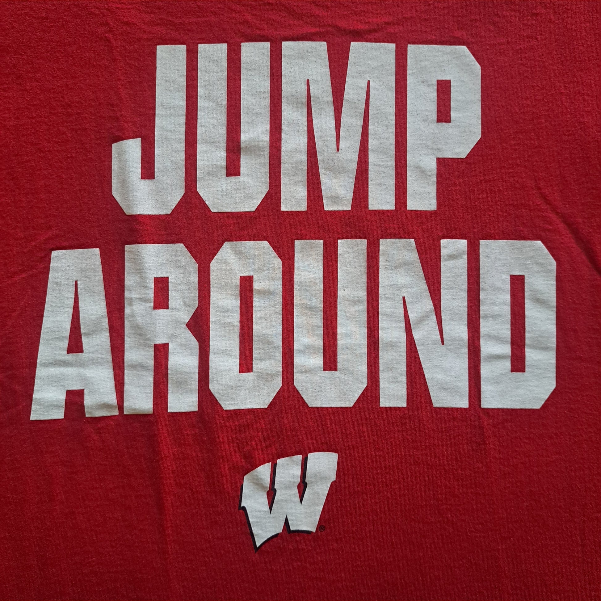 Description: classic, red "Wisconsin Badgers" Jump Around football graphic t-shirt.