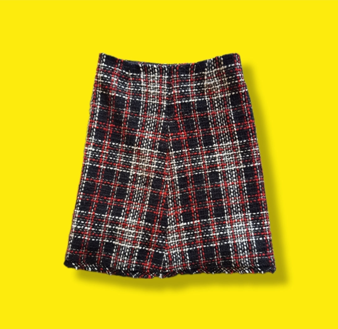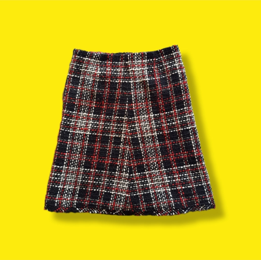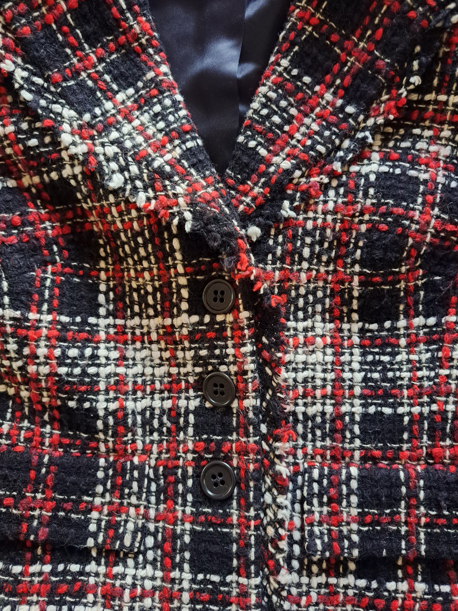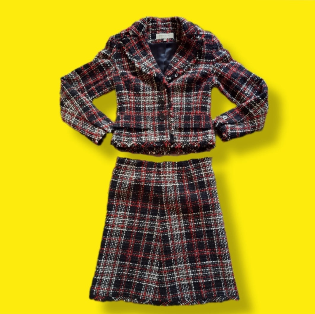 Description: red, black and white plaid check pattern tweed two-piece jacket and skirt suit set with beautiful fringe details, 2 faux waist pockets and a lovely stretch.