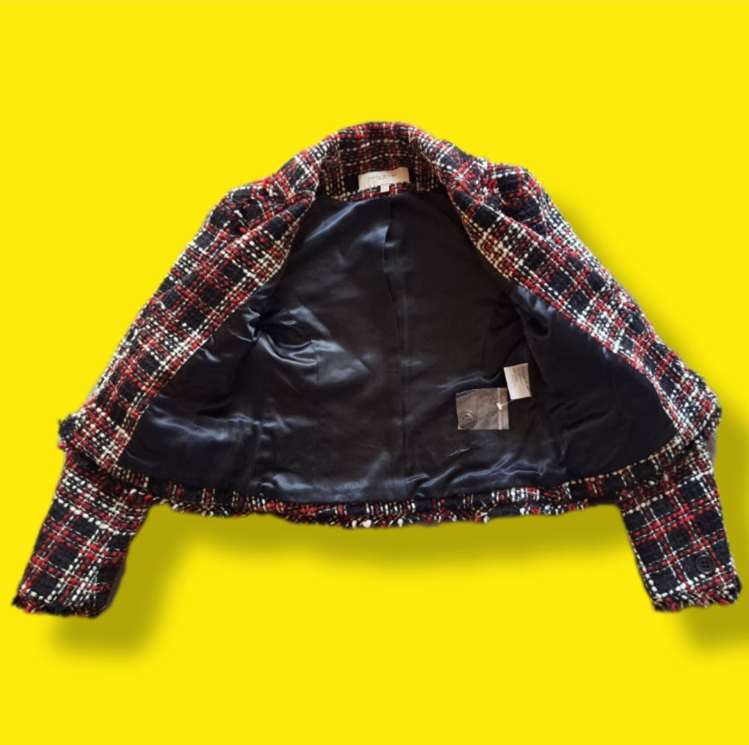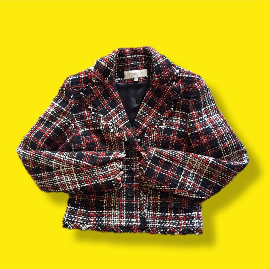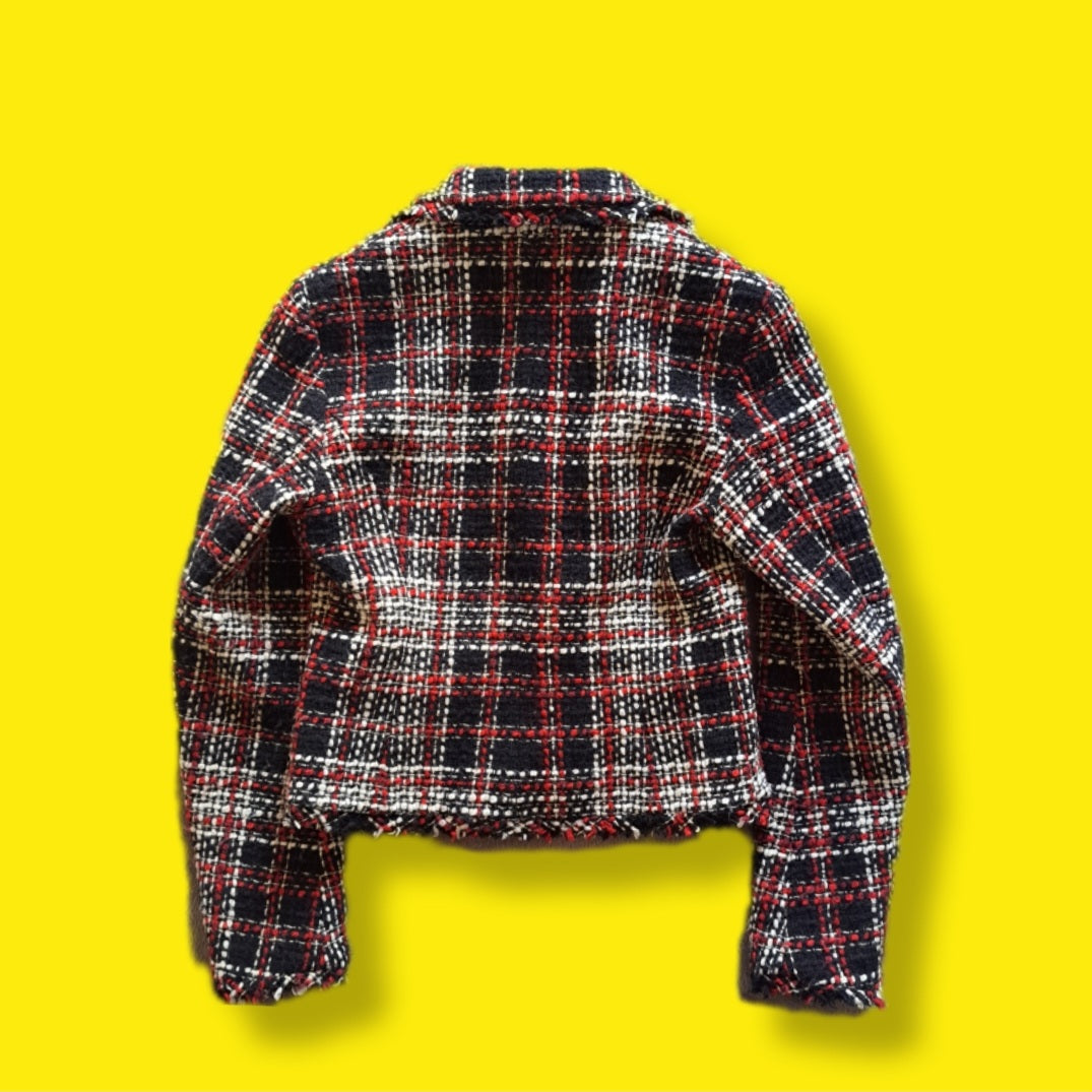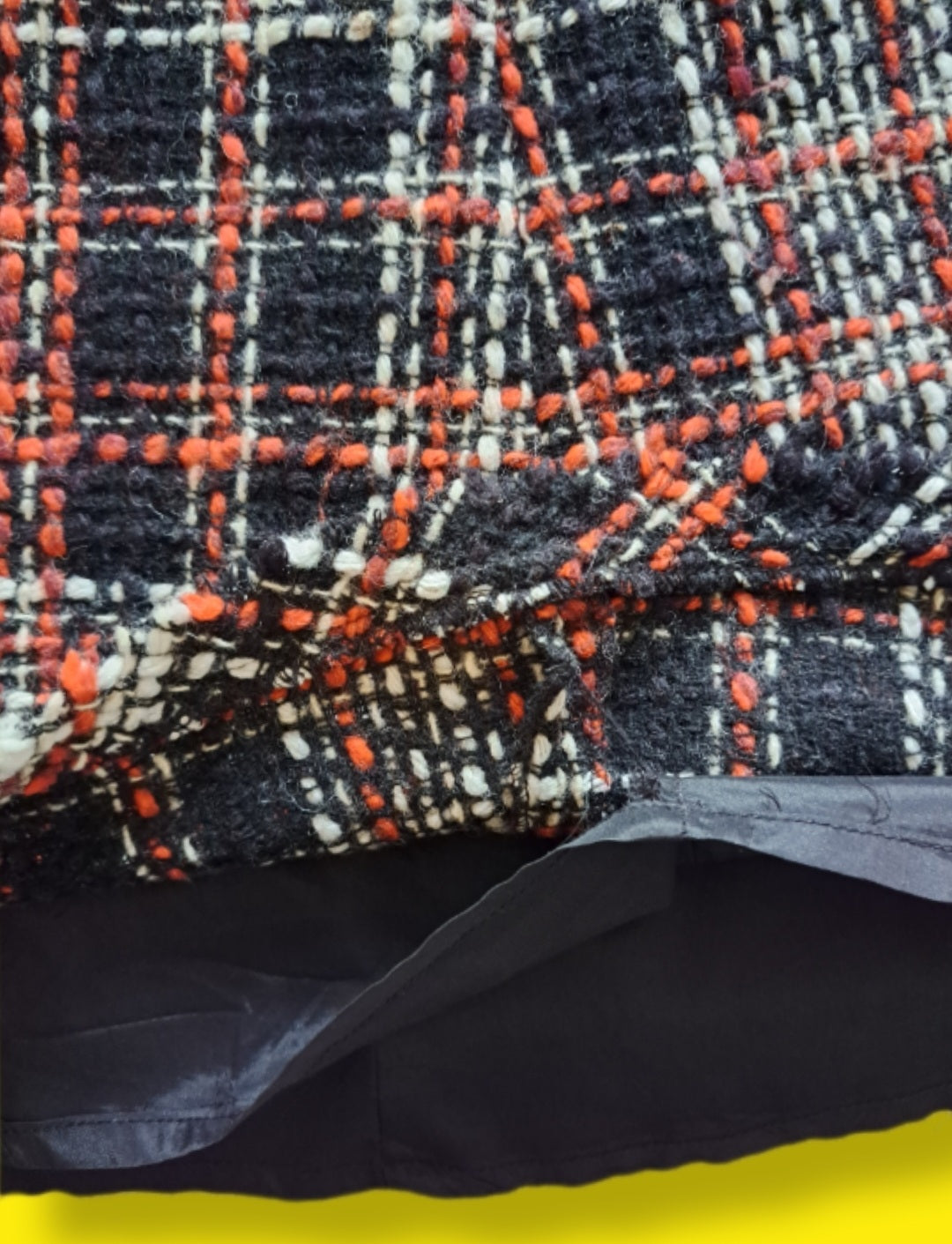 Description: red, black and white plaid check pattern tweed two-piece jacket and skirt suit set with beautiful fringe details, 2 faux waist pockets and a lovely stretch.