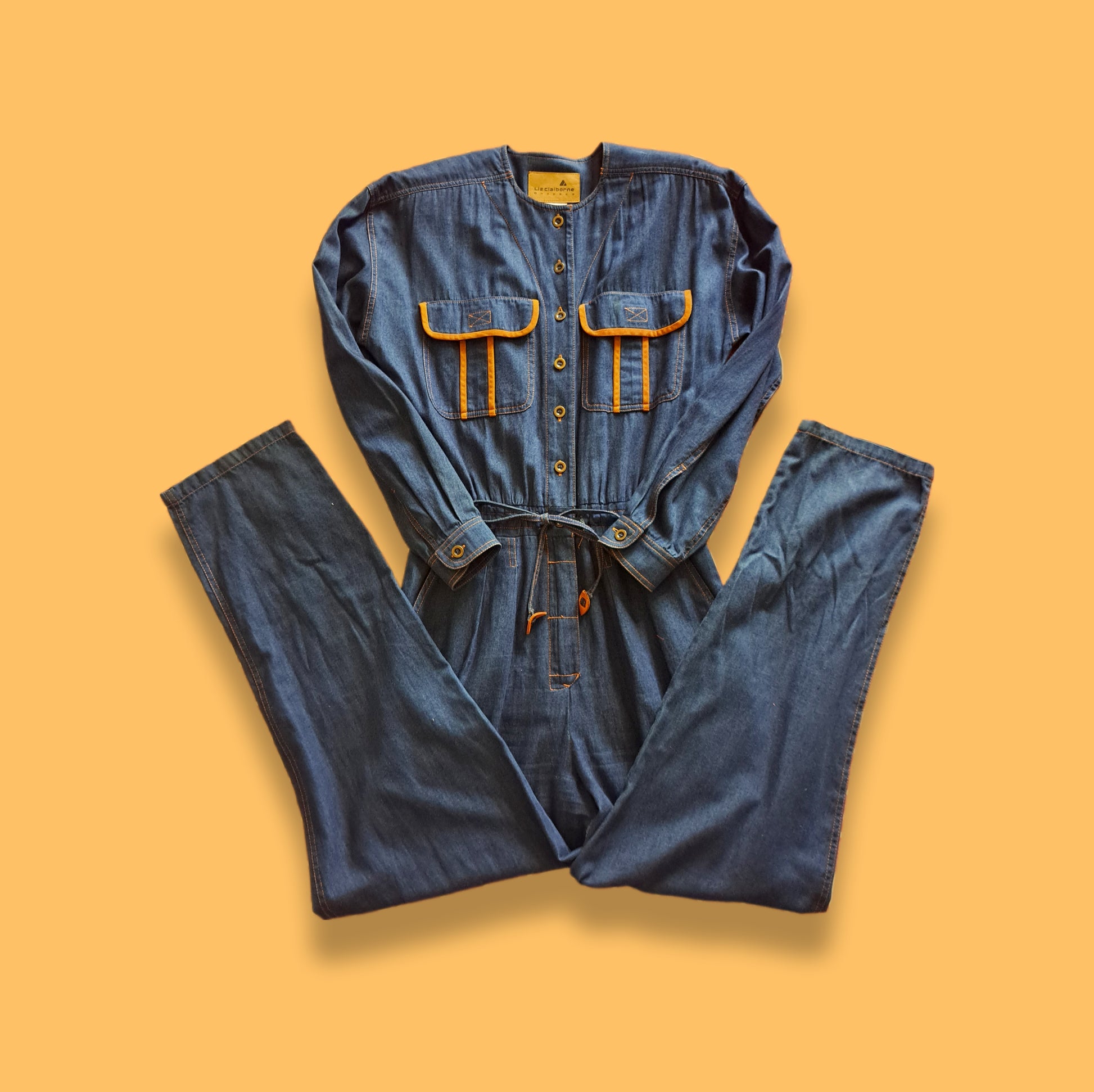 Description: amazing, long sleeve, denim one piece pants romper with belted drawstring waist and zip closure. The top has 2 flap velcro pockets, button-up wrists, removable shoulder pads. The bottoms are straight leg and have 2 hip pockets.