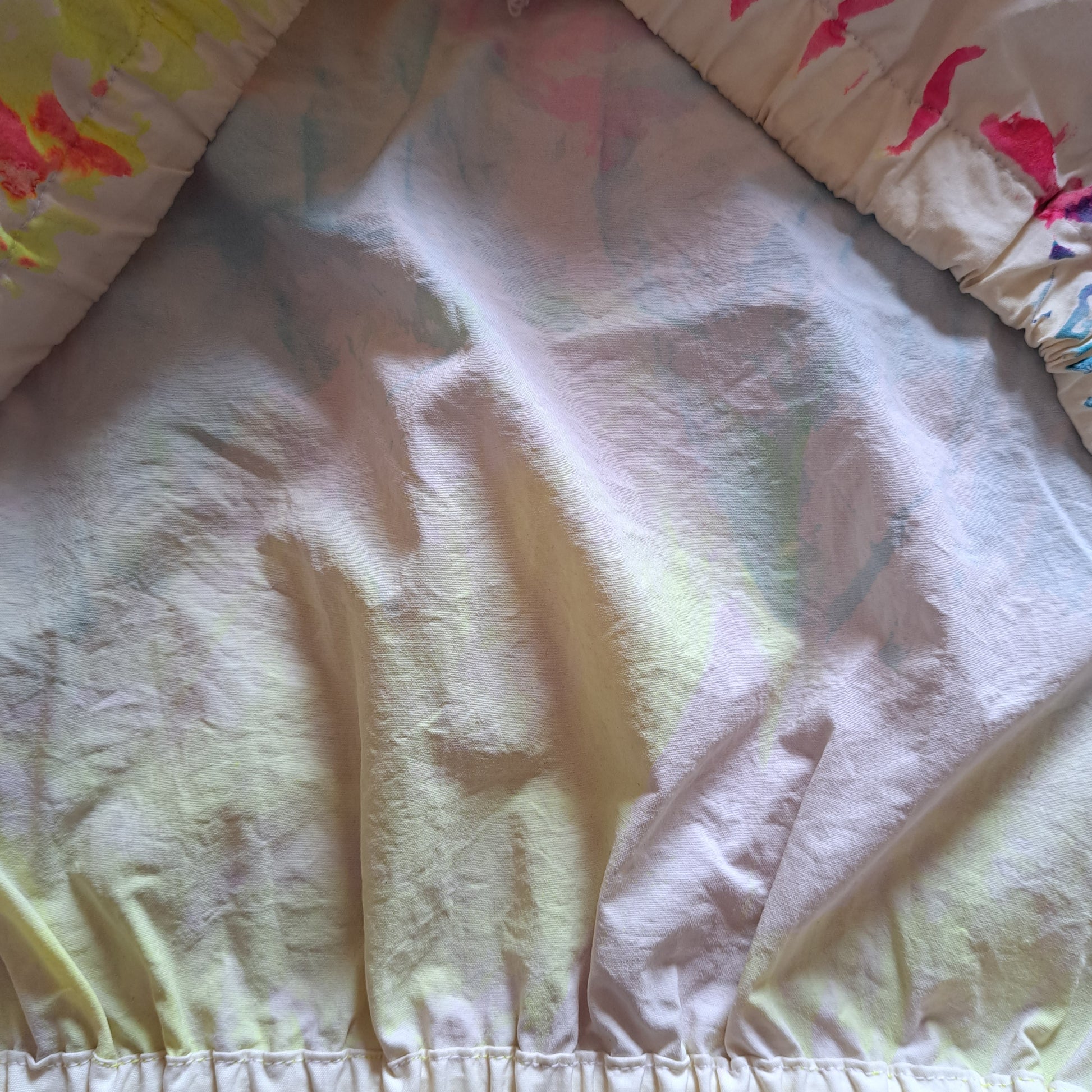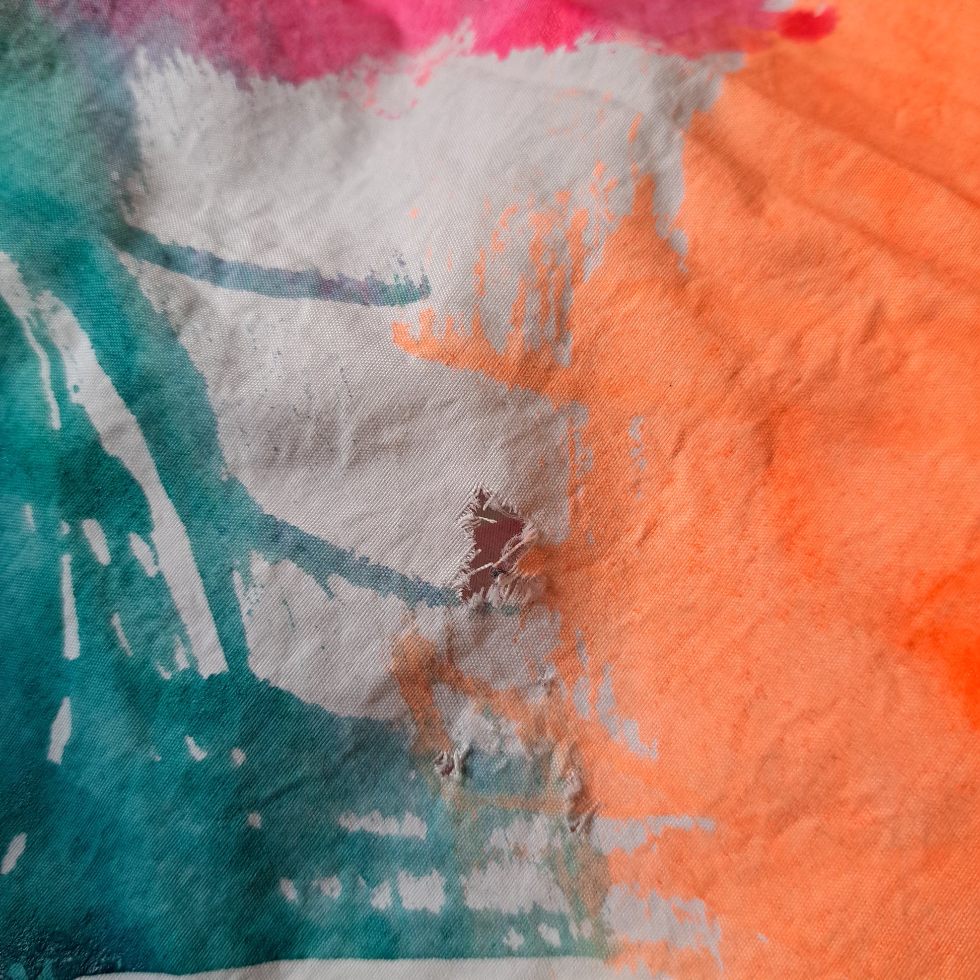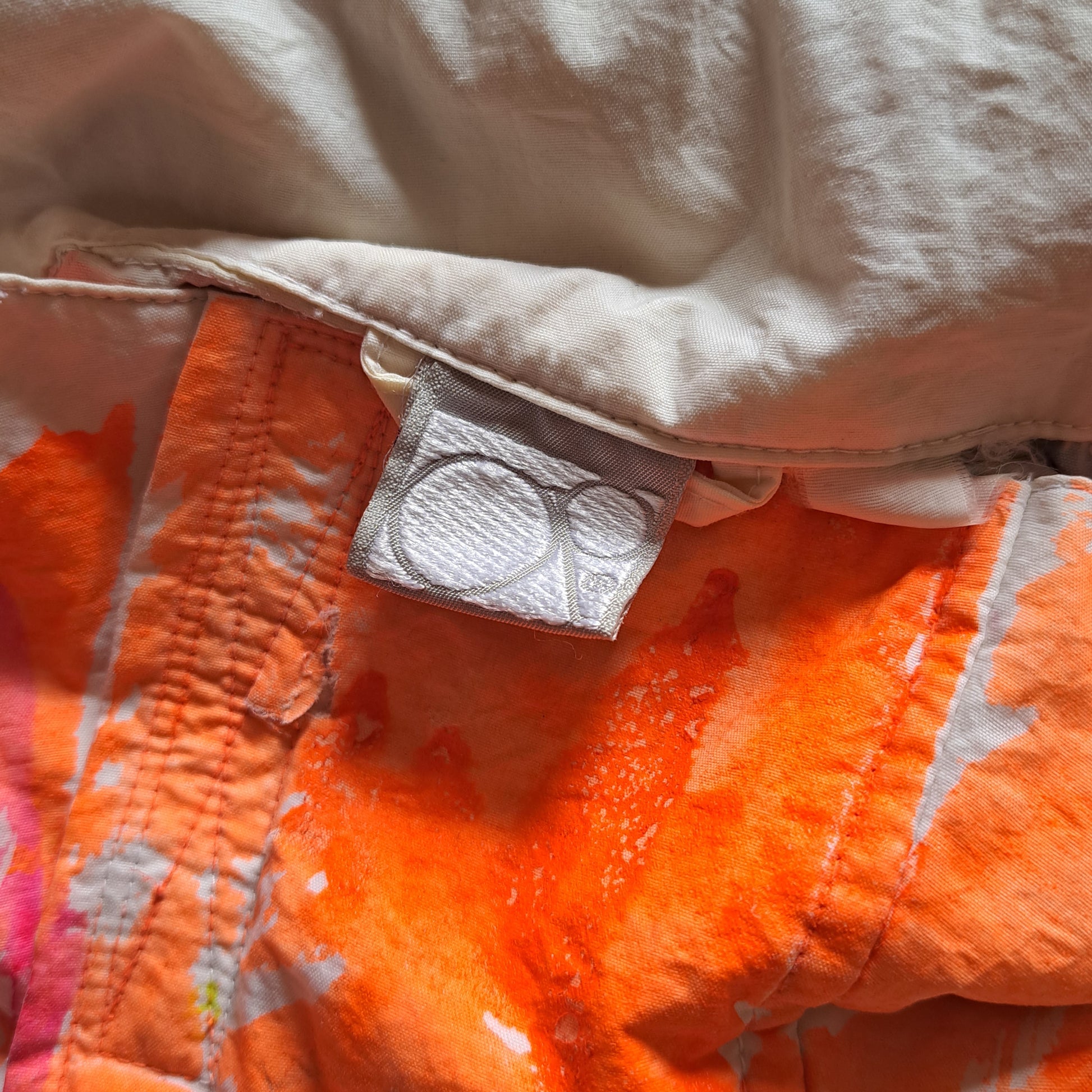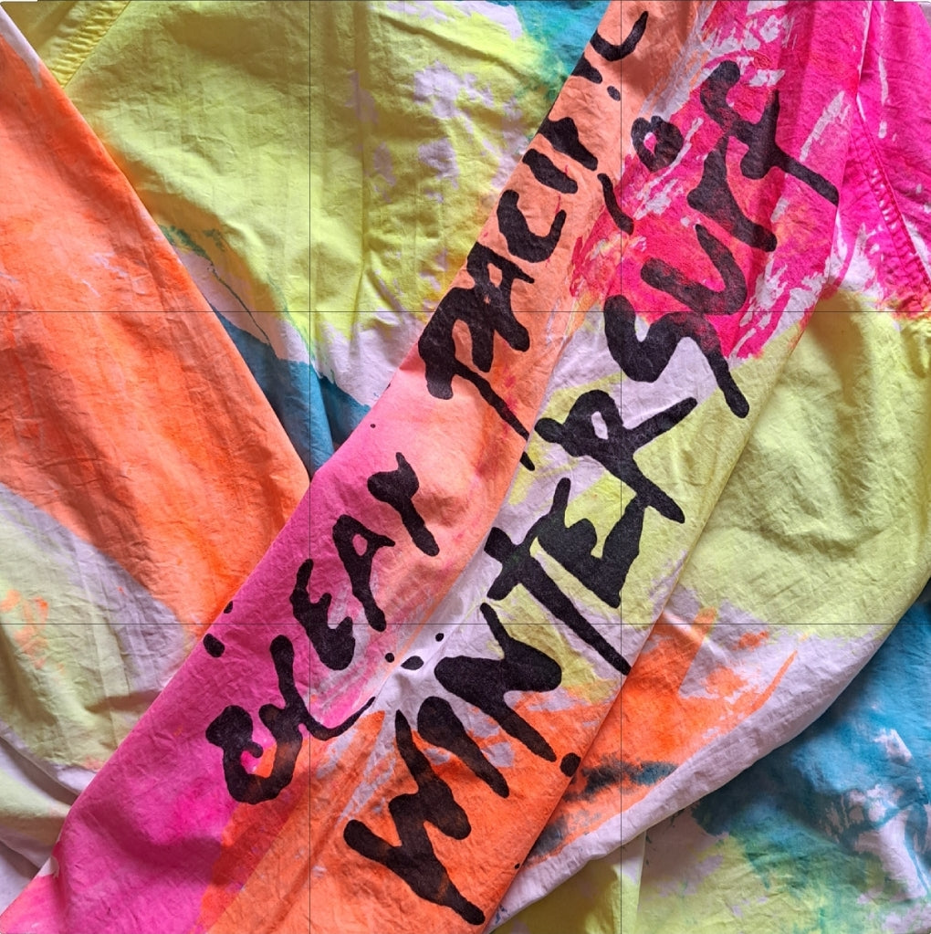 Description: vibrant white with neon green, blue, yellow and hot pink paint splatter details, velcro collar, waist and wrists, 2 zip pockets and an adjustable side zipper. (last 2 photos reflect tiny imperfections on a still perfect jacket)