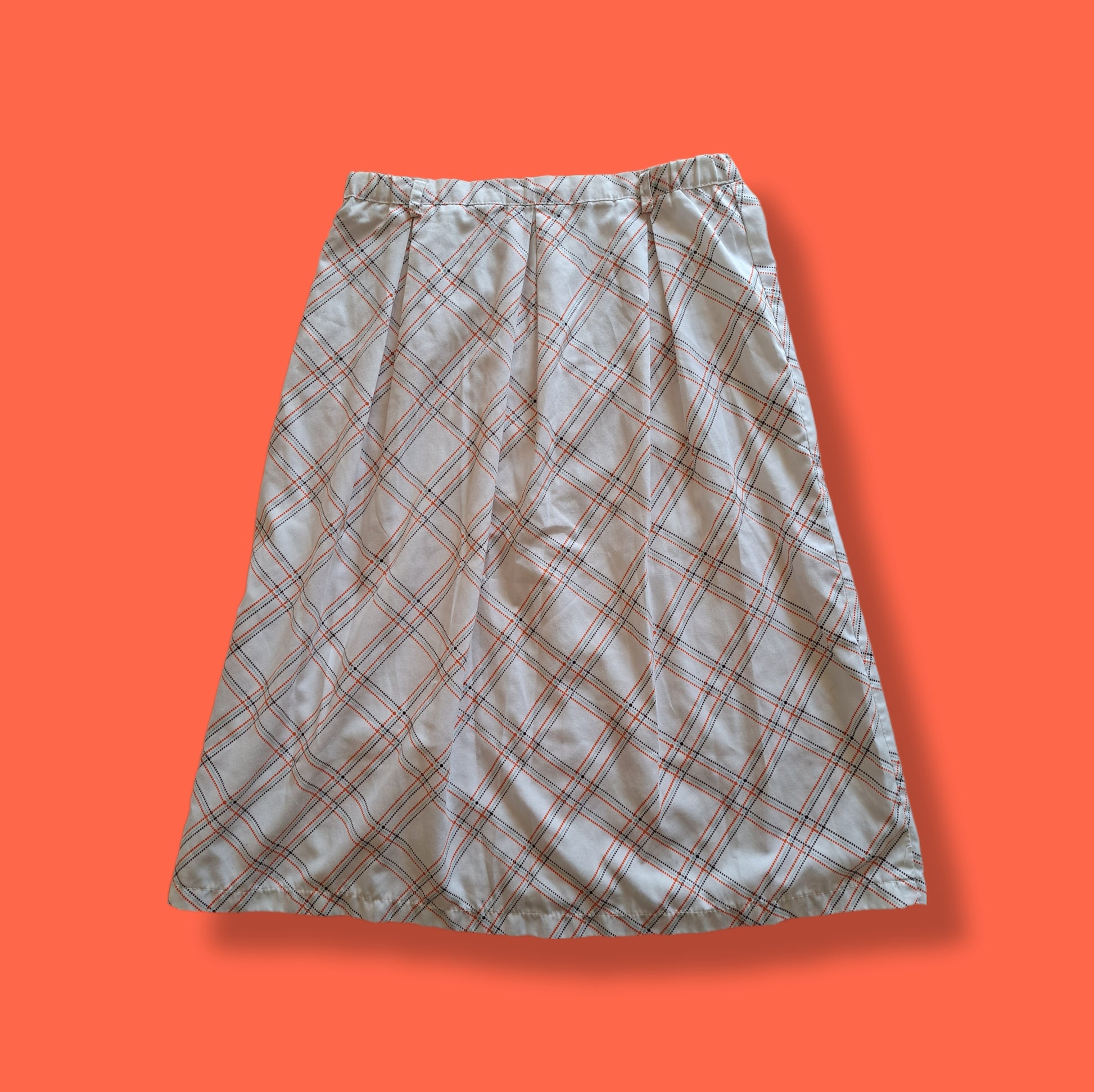 Description: beautiful, pleated, white a-line skirt with peach and brown plaid pattern and, belt loops, button and zip closure.