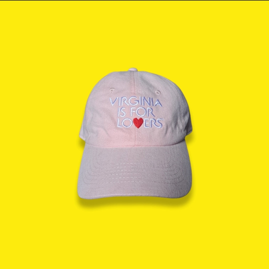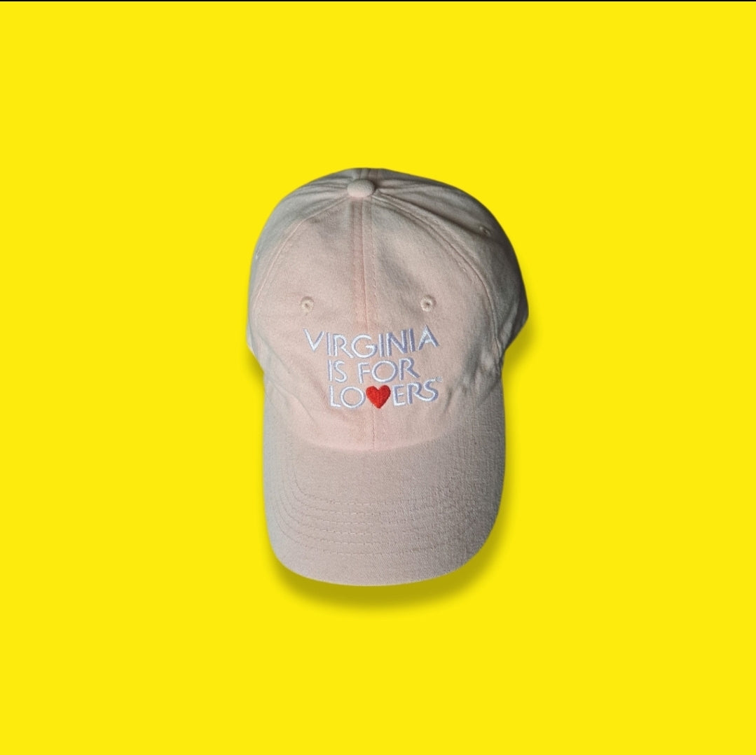Description: super soft and cute, light pink 5 panel hat with classic "Virginia is for Lovers" phrase on the front and adjustable velcro back.