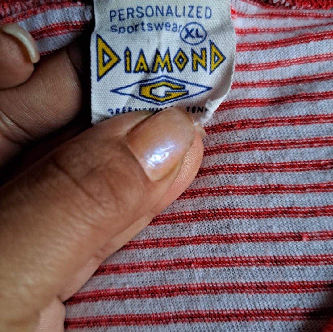 Description: relaxed, cozy and stylish red and white striped cut-off v-neck t-shirt with fun "Bourbon Street New Orleans" textured iron-on graphic on the front.
