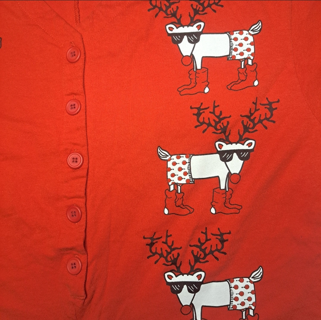 Description: super cute, soft and comfy shorts romper with reindeer graphics and "Red Toes" on the front.