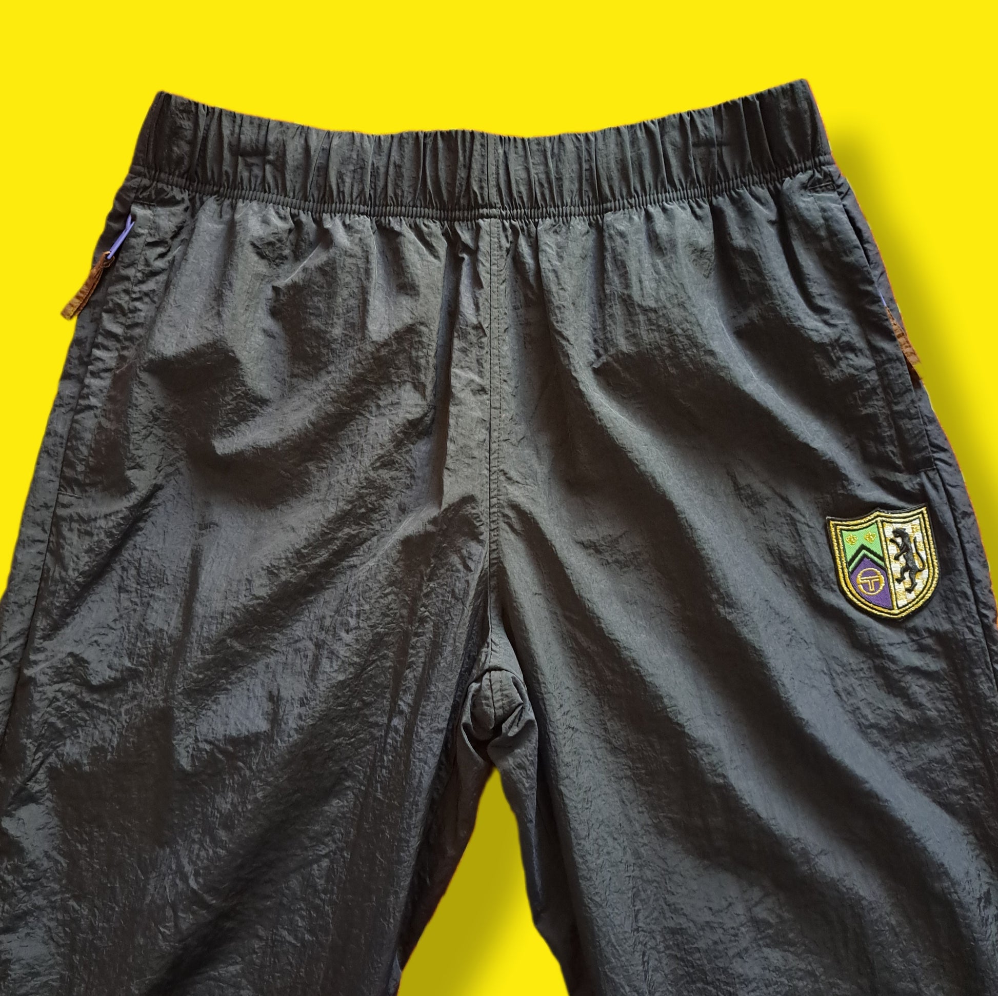 Description: super cool, black jogger pants with green, purple and gold details, and 2 front zip pockets, 1 back zip pocket, zip closure. Sergio Tacchini crest embroidery on front. This is a collaboration with A$AP Nast Novaro.