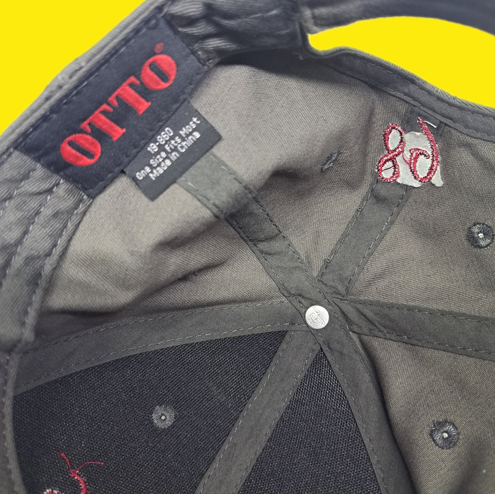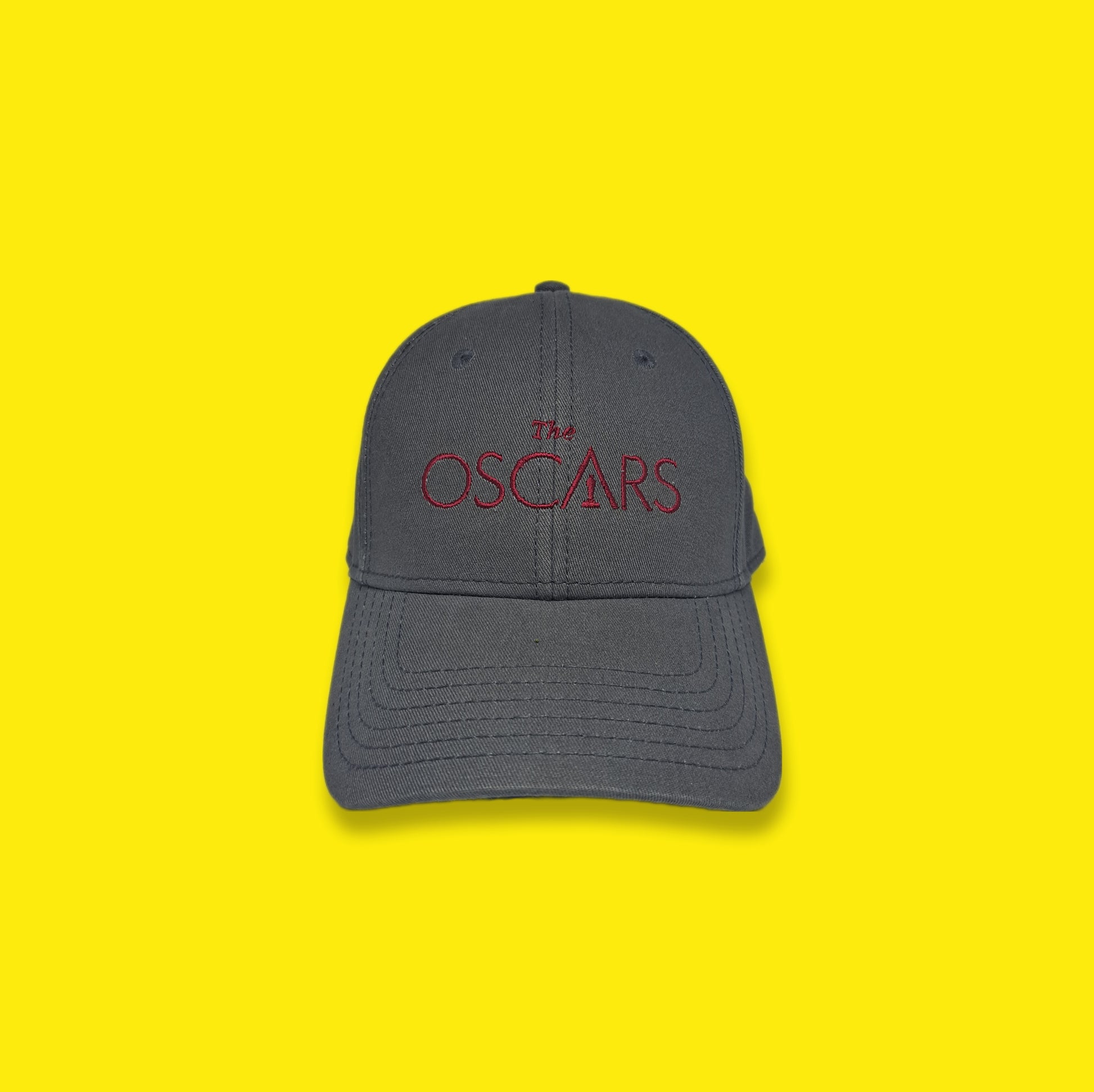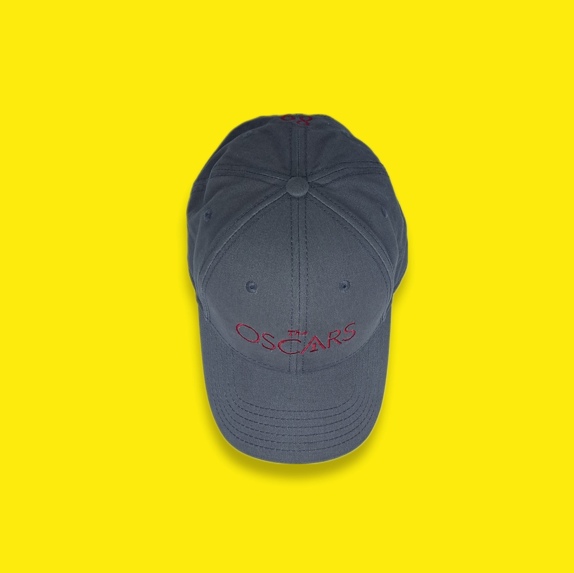 Description: dark gray 6 panel hat with burgundy "The Oscars '89" embroidered on the front and adjustable velcro back.