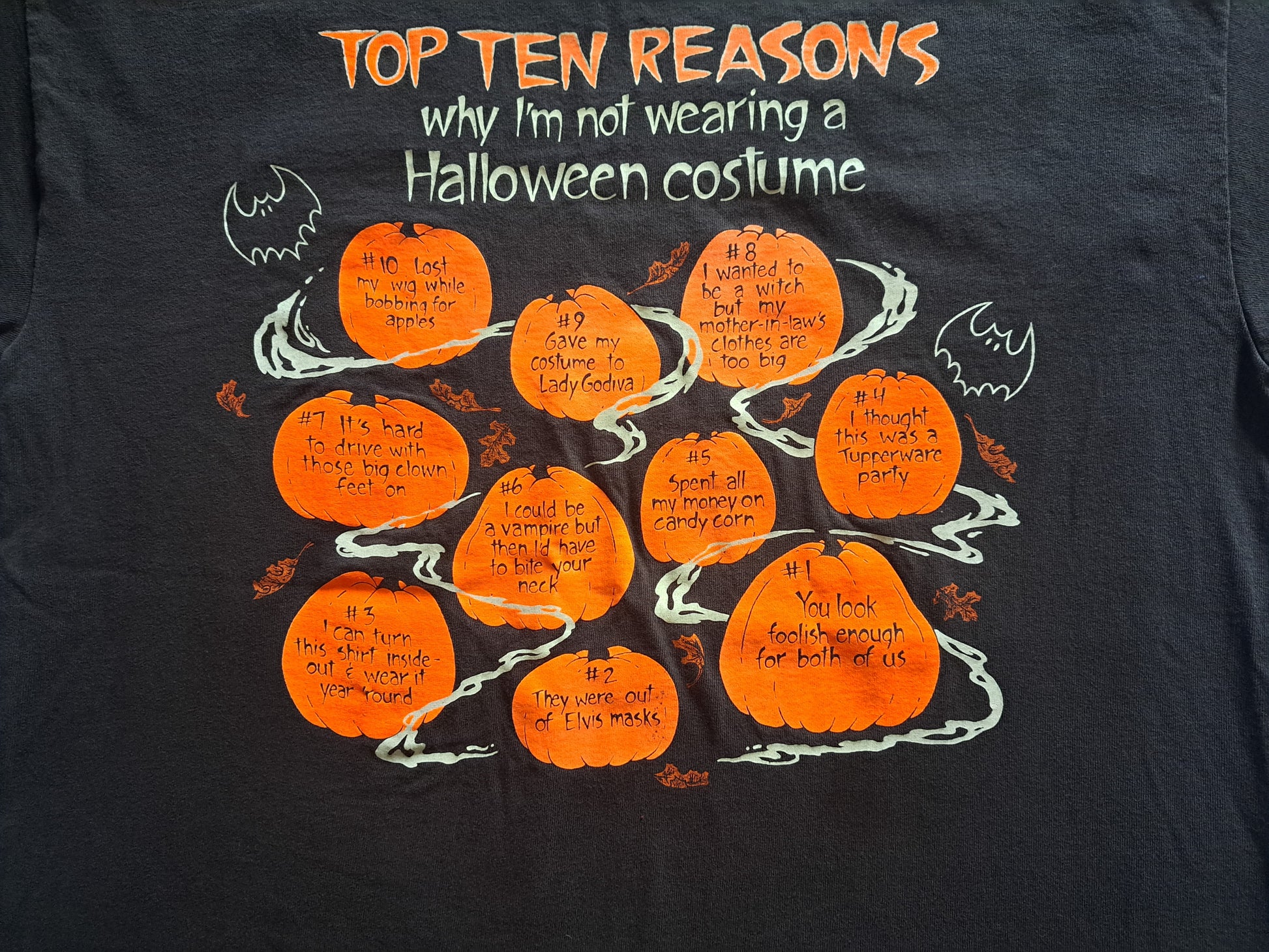 Description: deep black with orange pumpkin graphics and funny "Top 10 Reasons Why I'm Not Wearing a Halloween Costume" sayings on the front.