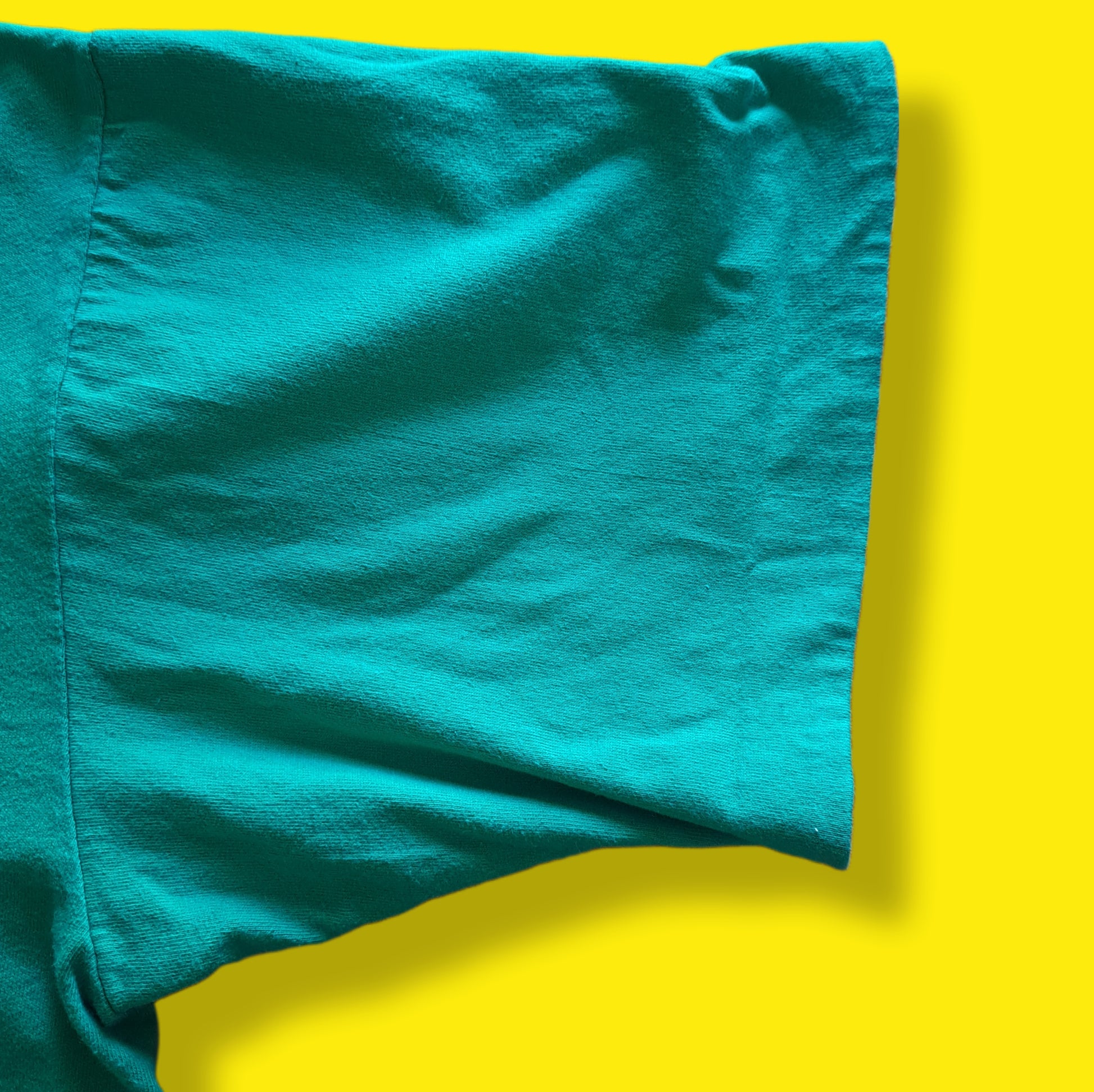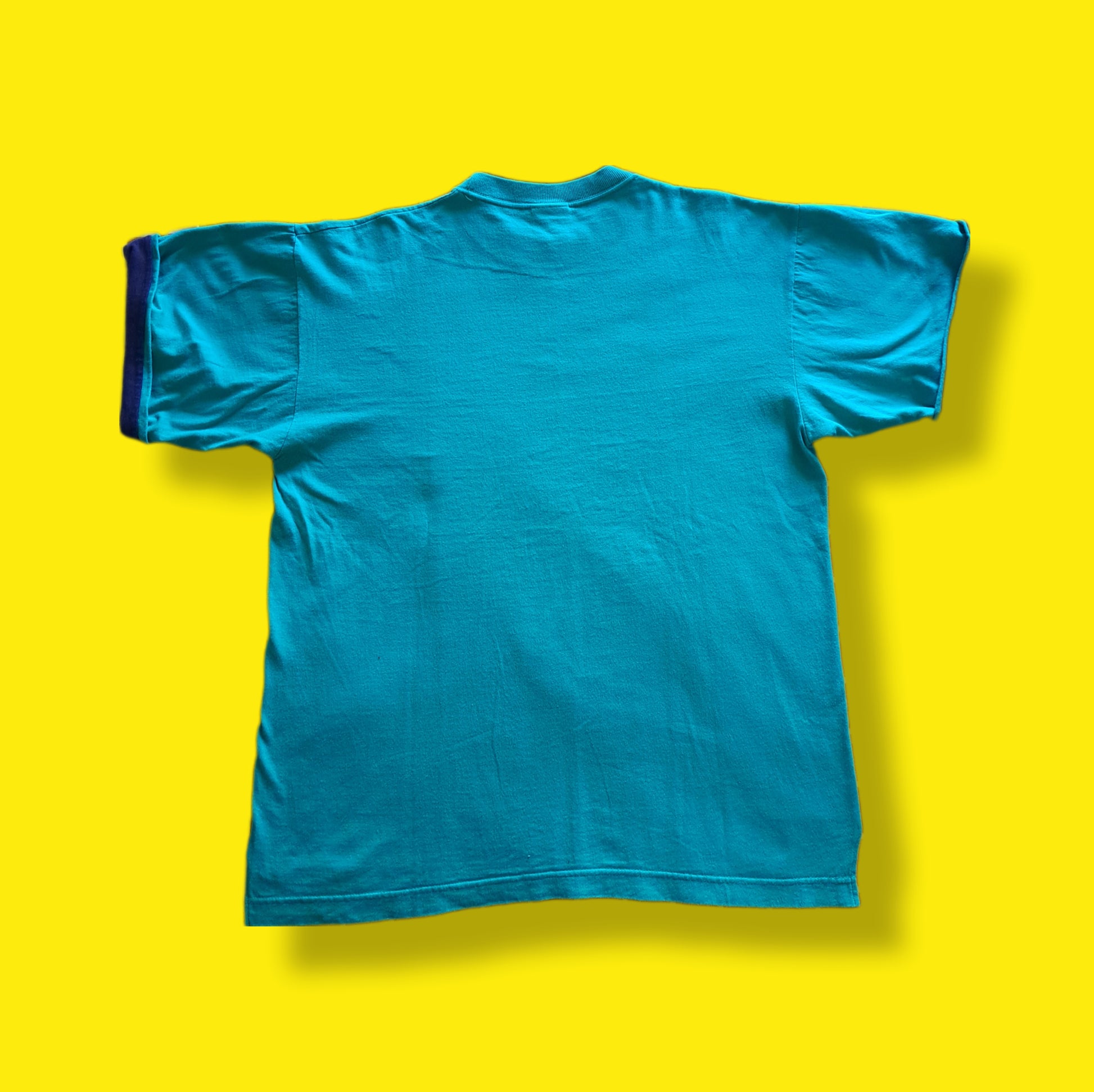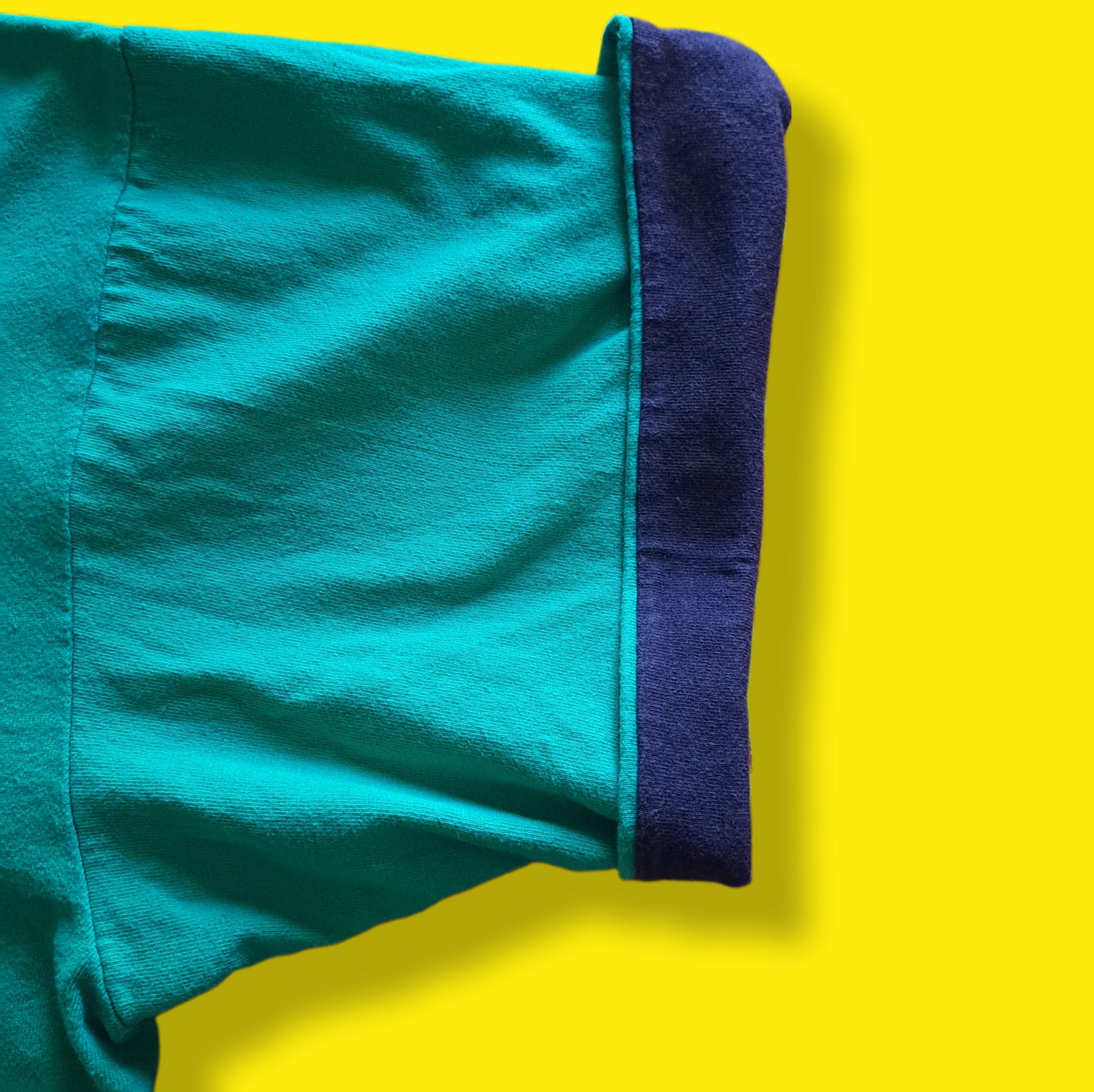 Description: vibrant, aqua green t-shirt with navy blue fold-over sleeves and "Desert Springs Palm Desert Resort & Spa" graphic on the front.