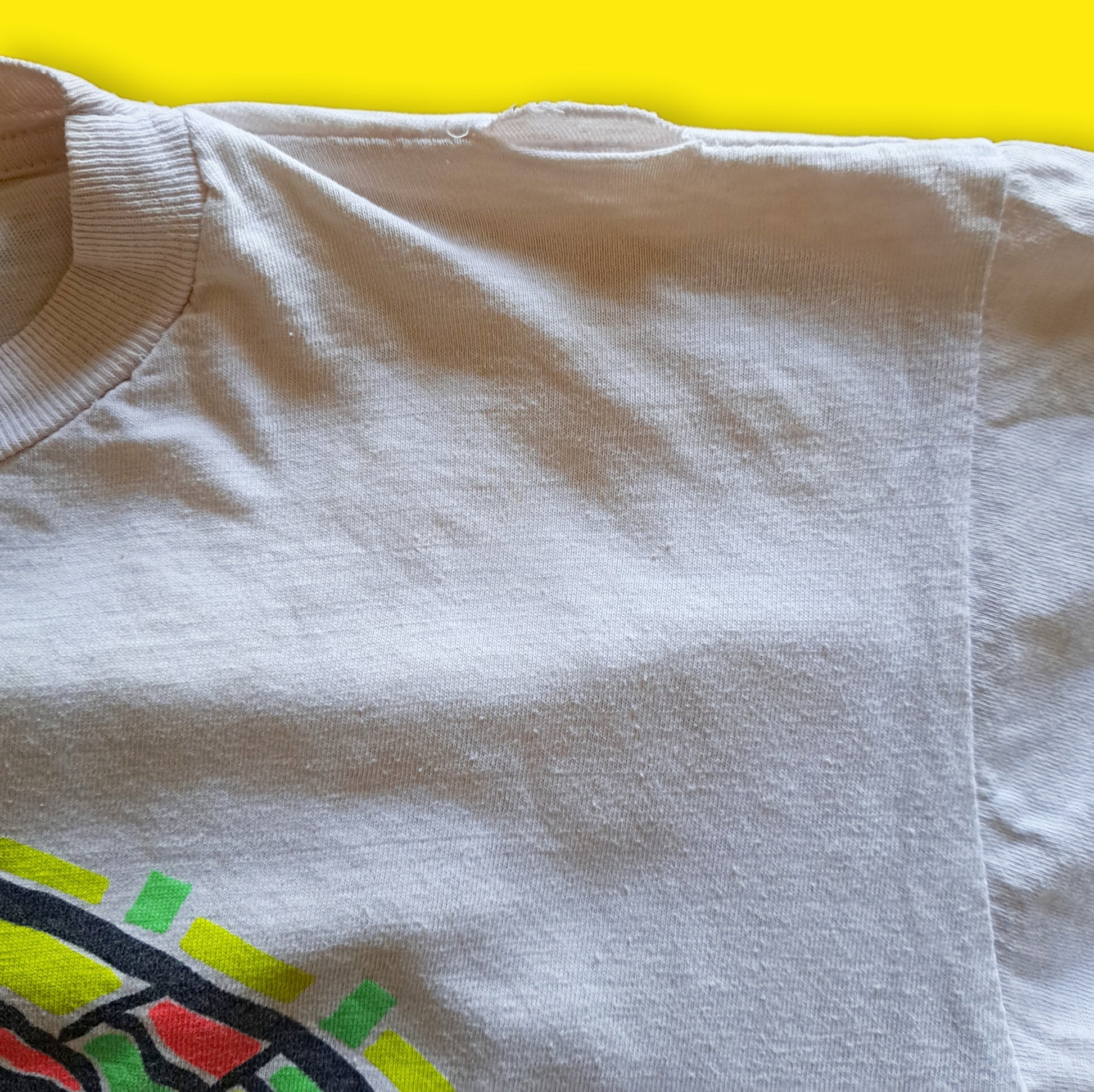 Description: super cute and stylish, white, cut-off, midriff t-shirt with "Venice Beach California" textured, neon graphic on the front.