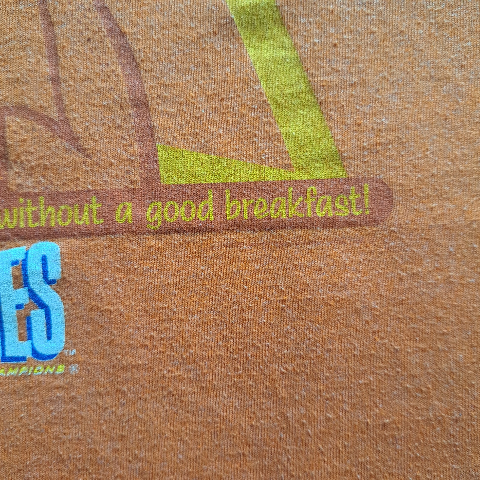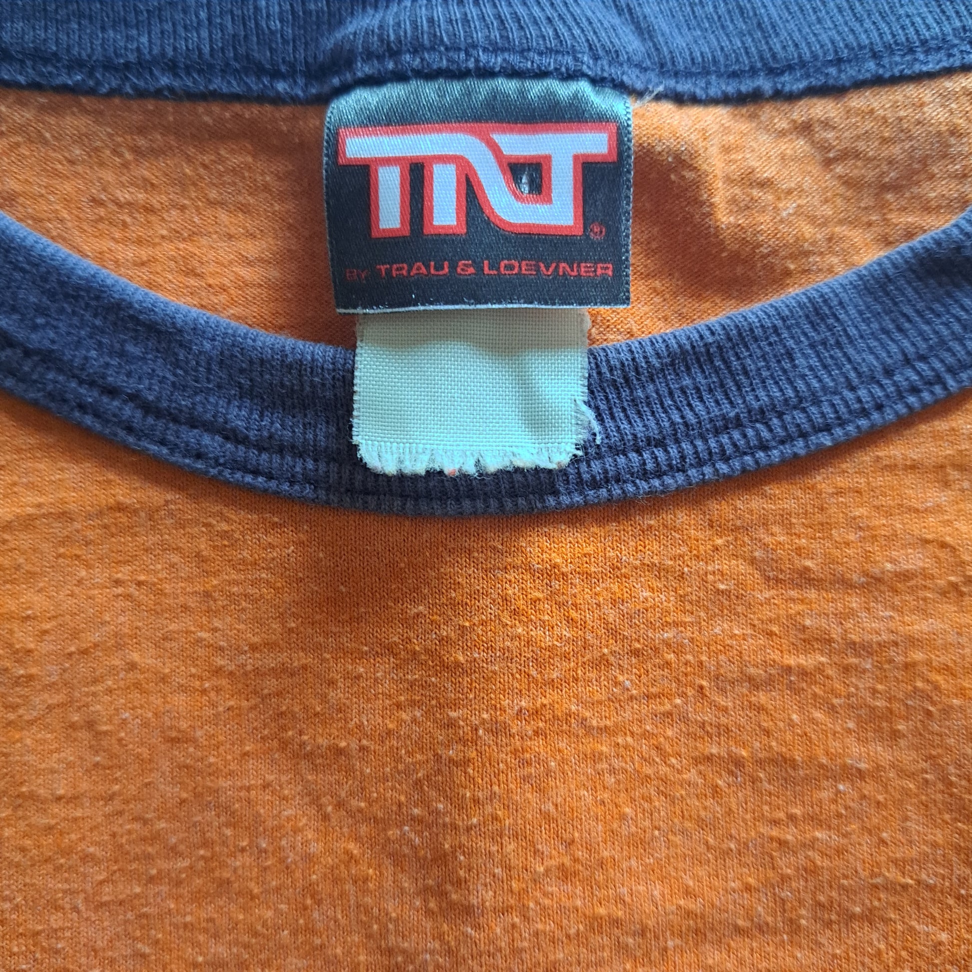 Description: orange and navy, short sleeve, relaxed ringer t-shirt with Wheaties graphic and sarcastic joke phrase "Chicks dig the Pipes" on the front.